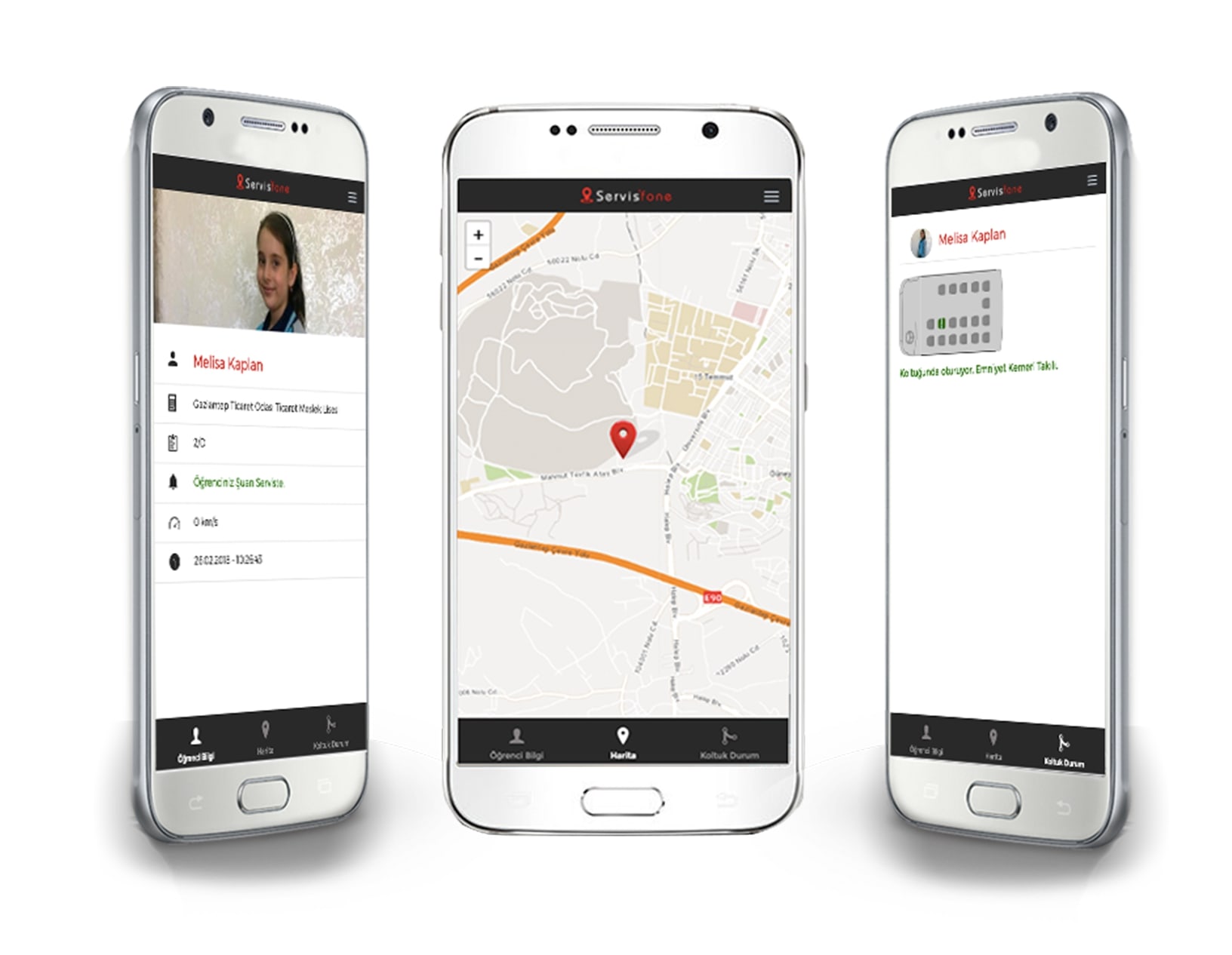 Veliler için sağladığımız mobil uygulama sayesinde veliler bu uygulamadan çocuklarının servis içindeki durumunu anlık olarak izleyip servisi de harita üzerinden takip edebilecekler. Bu sayede çocuğunun serviste oturup oturmadığını, emniyet kemerinin takılı olup olmadığı ve de servisin nerede olduğundan haberdar olarak çocuğunun güvenle seyahat ettiğini bilebilirler.
